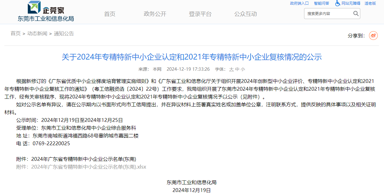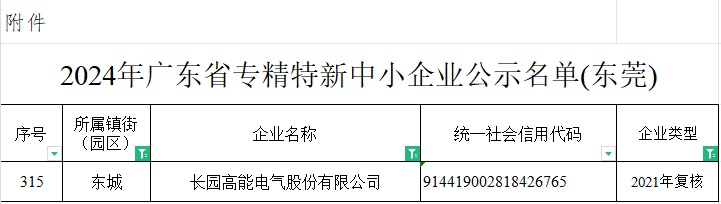 近日,东莞市工业和信息化局发布了《关于2024年专精特新中小企业认定和2021年专精特新中小企业复核情况的公示》,Z6.COM-尊龙集团高能顺利通过广东省专精特新中小企业复核。
